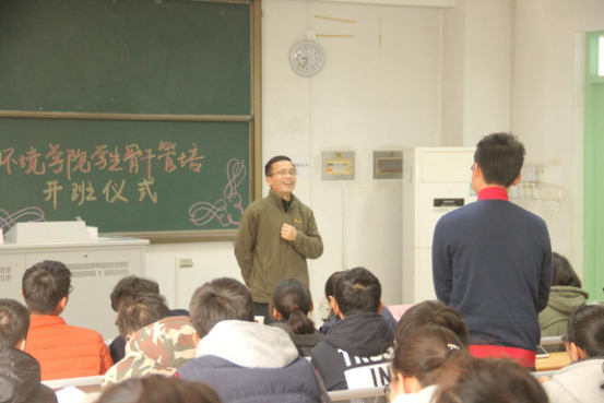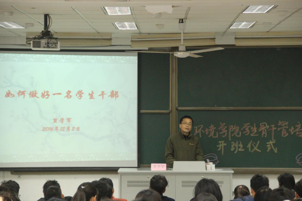 本次开班仪式的主讲人是韩漫 党委书记笪学军,此外出席本次活动的还有环境学院党委副书记曹松祥,2014级辅导员老师曾莉、2015级辅导员老师王剑以及2016级辅导员老师金意倩。参加管培活动的有2016级年级委员、各班班级委员以及院三大组织的干事们,共160名学生骨干。