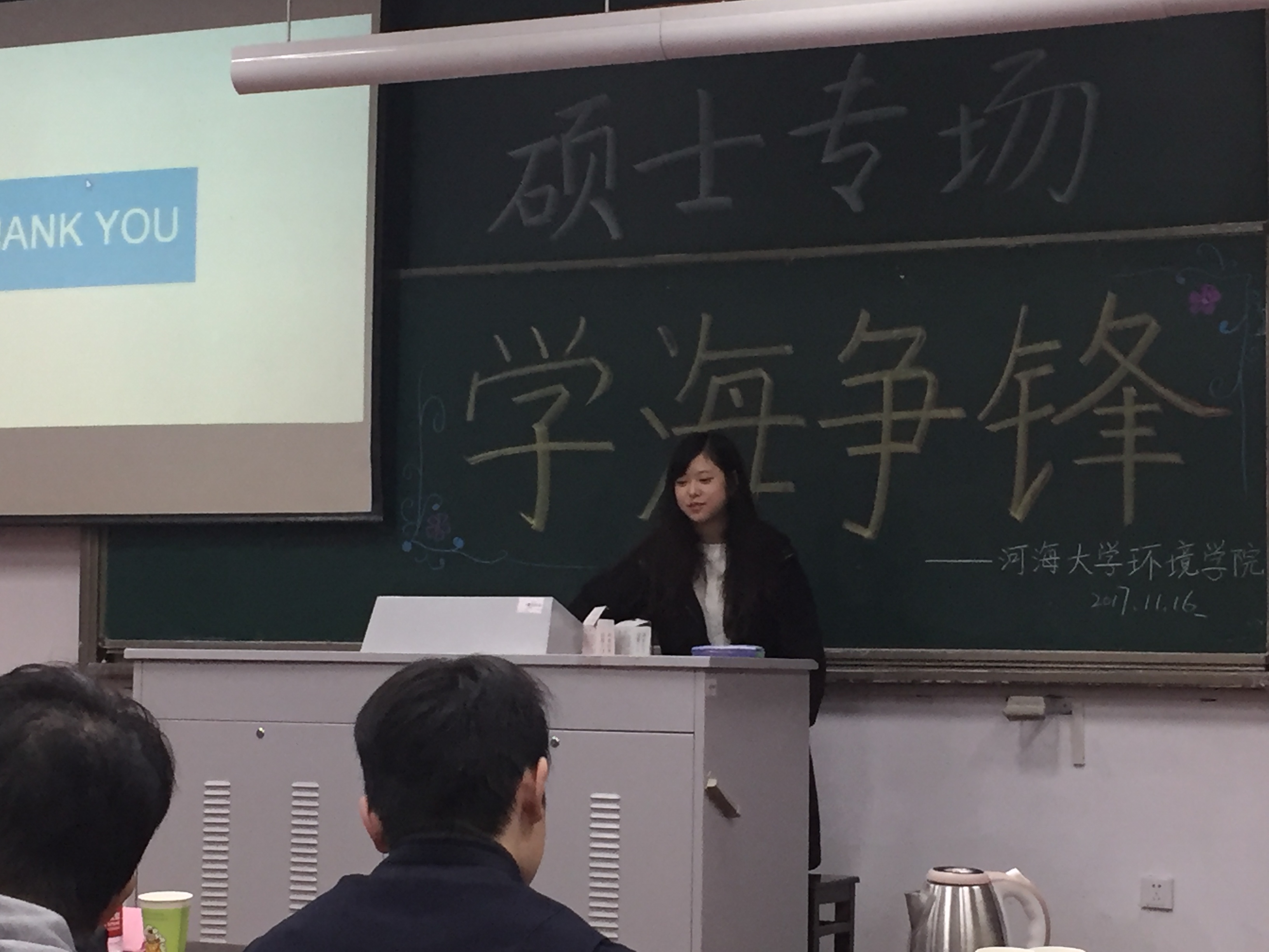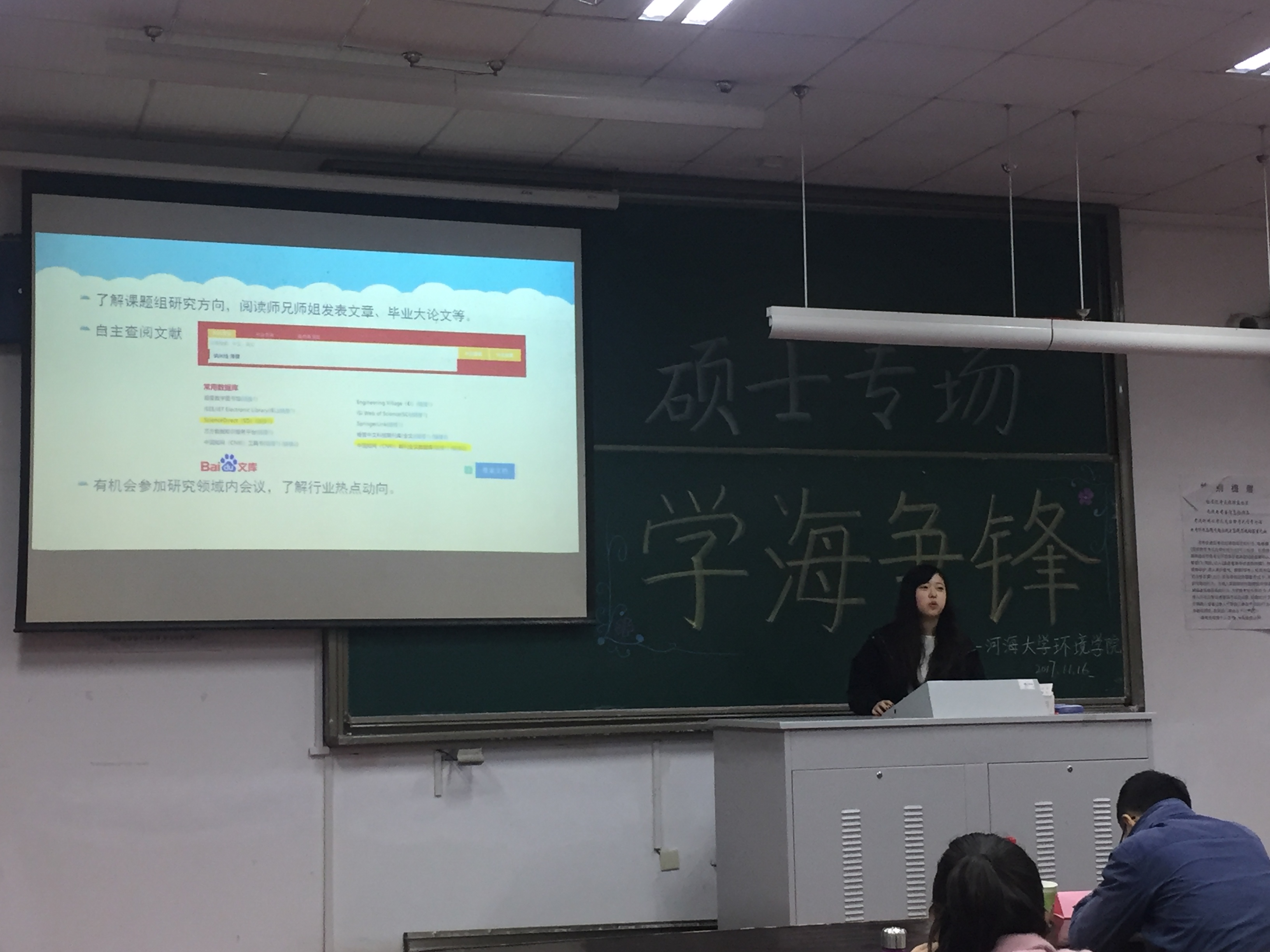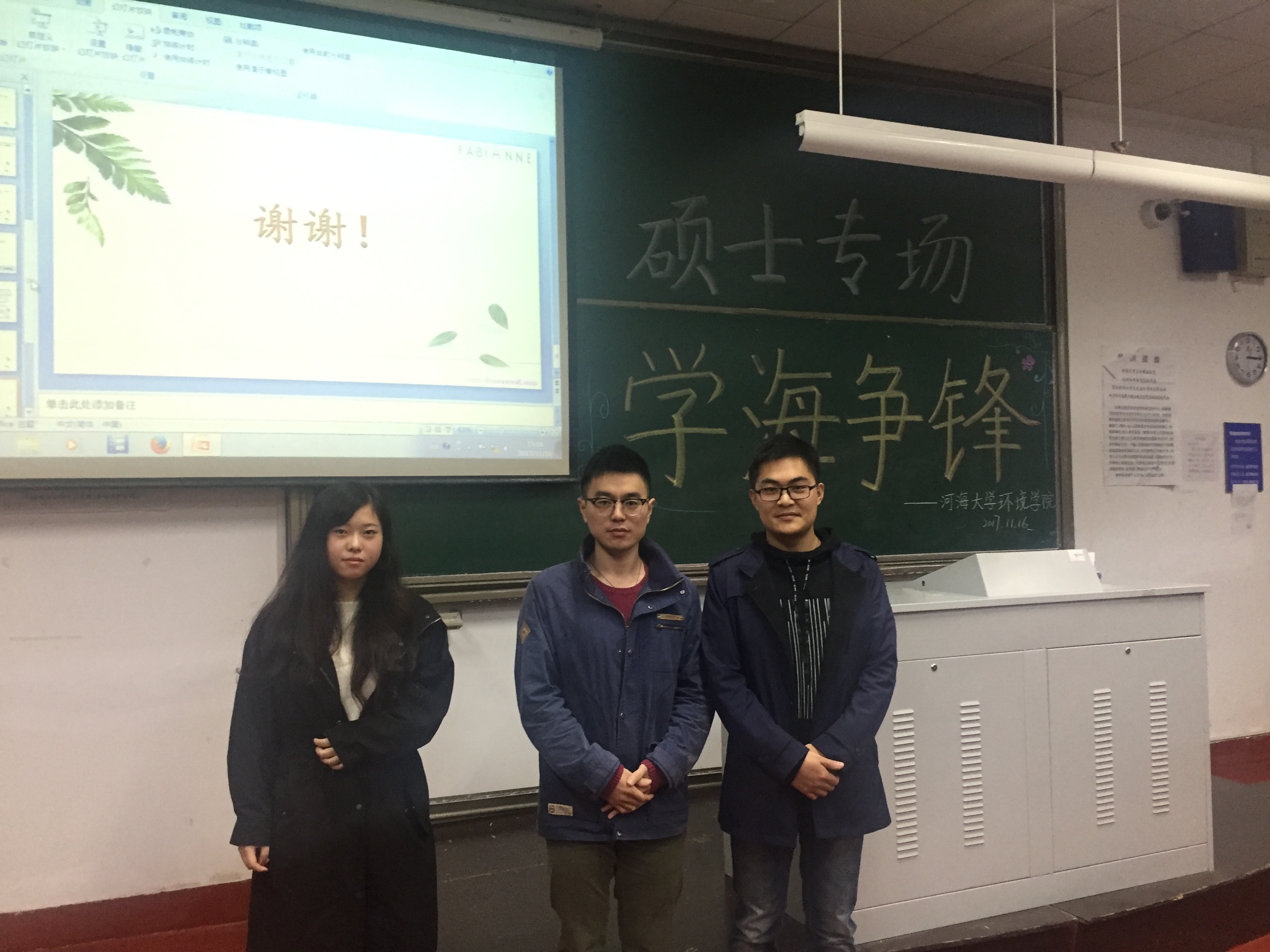 2017年11月16日下午,由韩漫 研会研科协策划并举办的“学海争锋——硕士专场”学术讲座于水利馆B101教室举行。本次讲座的三位主讲均是韩漫 优秀的研究生,都是今年国家奖学金的获得者,分别是16级市政工程专业的曹臻、15级市政工程的张佳男、15级环境科学与工程的沙海涛。