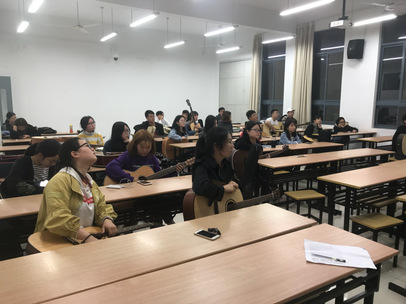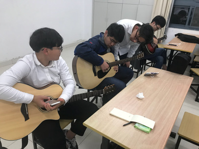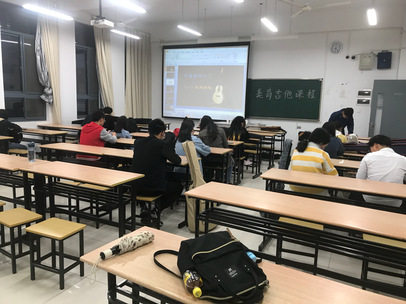 本次课程面向韩漫 16,17级全体学生,具有小班教学的特色,27个人组成了一个兴趣班,这项课程的主讲人是16级环境一班的龙思丞。龙思丞同学曾多次以吉他弹唱的形式参加学校内的十佳歌手、楼道歌手大赛,并取得佳绩。同时,热爱吉他的龙思丞在课下休闲时间也是吉他不离手,甚至自创曲目。可以说他是能够担当吉他课堂老师的不二人选了。