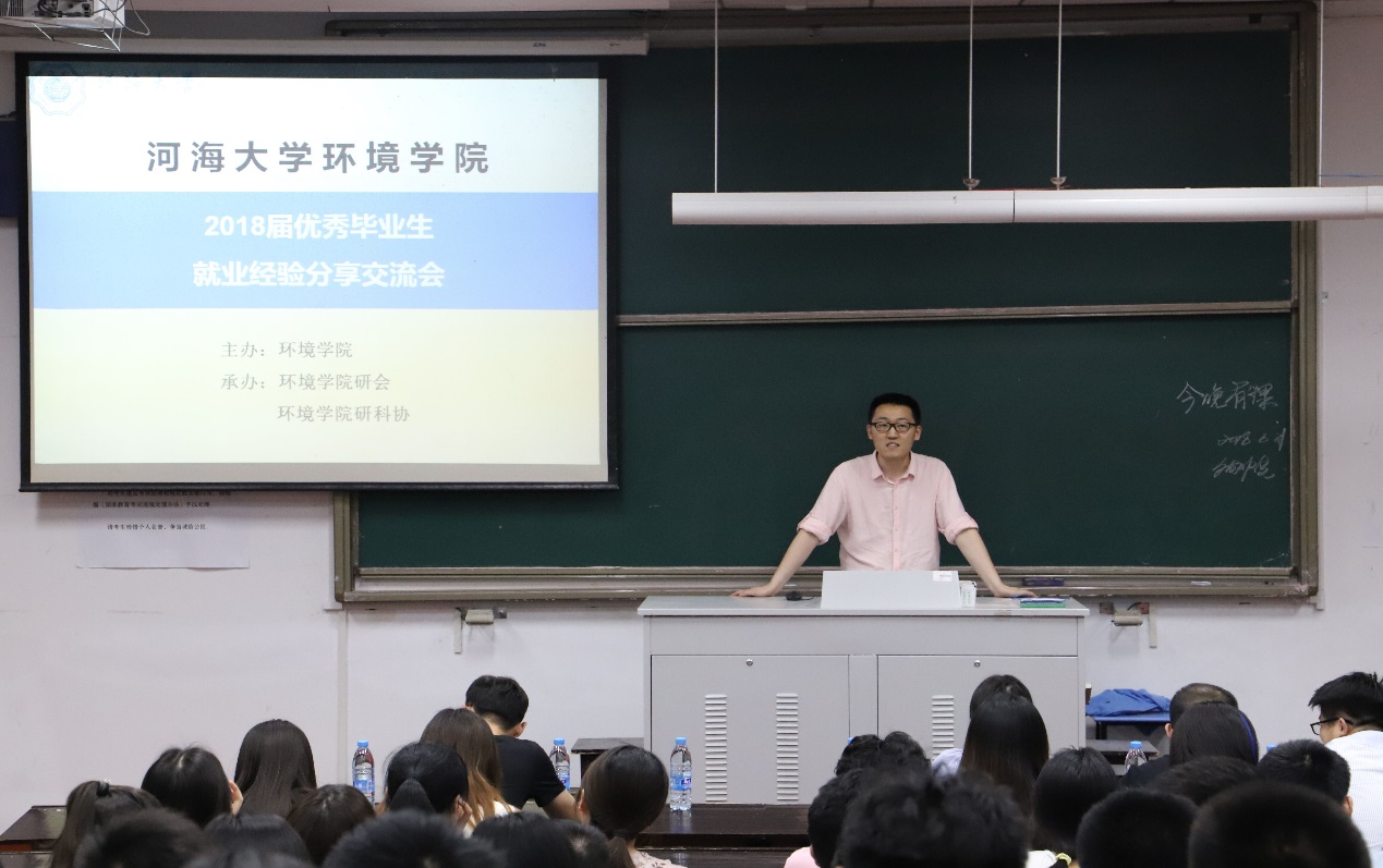 河海大学环境学院2018届优秀毕业研究生就业经验分享交流会于6月21日晚6:30在水利馆B101成功召开。会上请到了七位2018届毕业研究生,他们分别是2016级环境工程专业的杨玺、邢明明,2015级环境科学与工程专业的朱晓晓、孙红伟、周睿,2015级市政工程专业周仕华和谭怡雯。