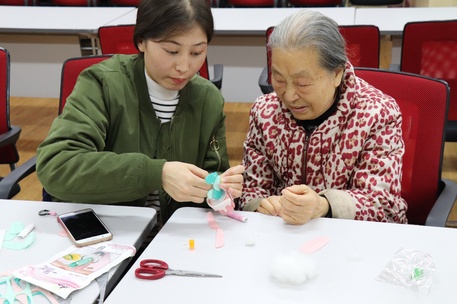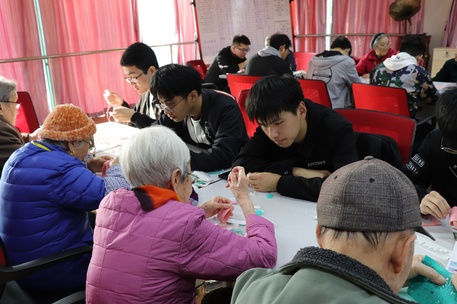 下午2时30分,志愿者们到达了瑞芝康健老年公寓,在简单的任务布置和材料准备后,志愿者们前往老人们的休息室,与爷爷奶奶们一起完成手工作品。