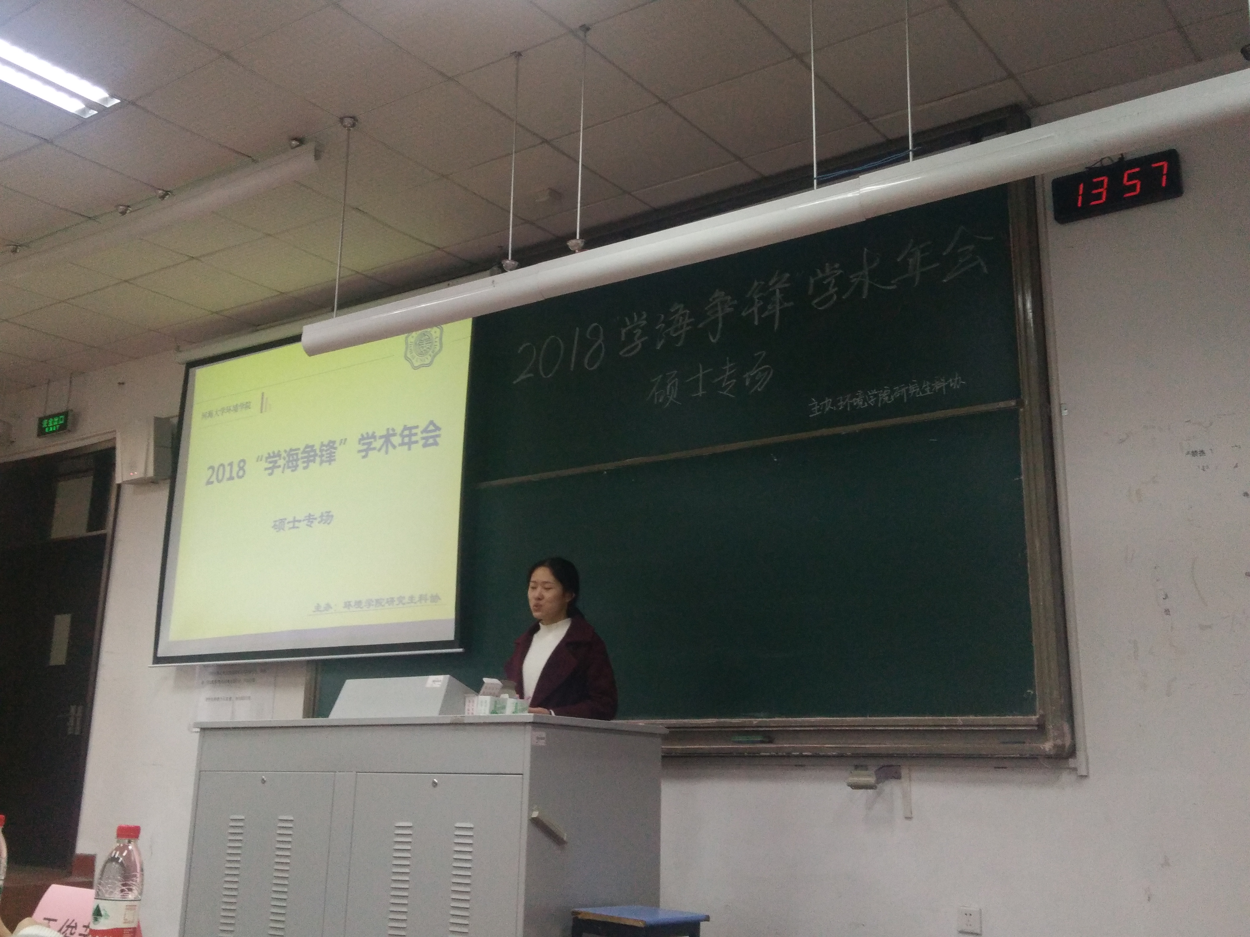 2018年11月28日下午2点,由韩漫 研究生科协主办的 “学海争锋”学术年会硕士专场于水利馆B101举行。会议全程由研科协学术部成员孙娇娇同学主持。此次大会邀请了王俊芳、王汝霞师姐和郑健师兄分别作主题汇报。