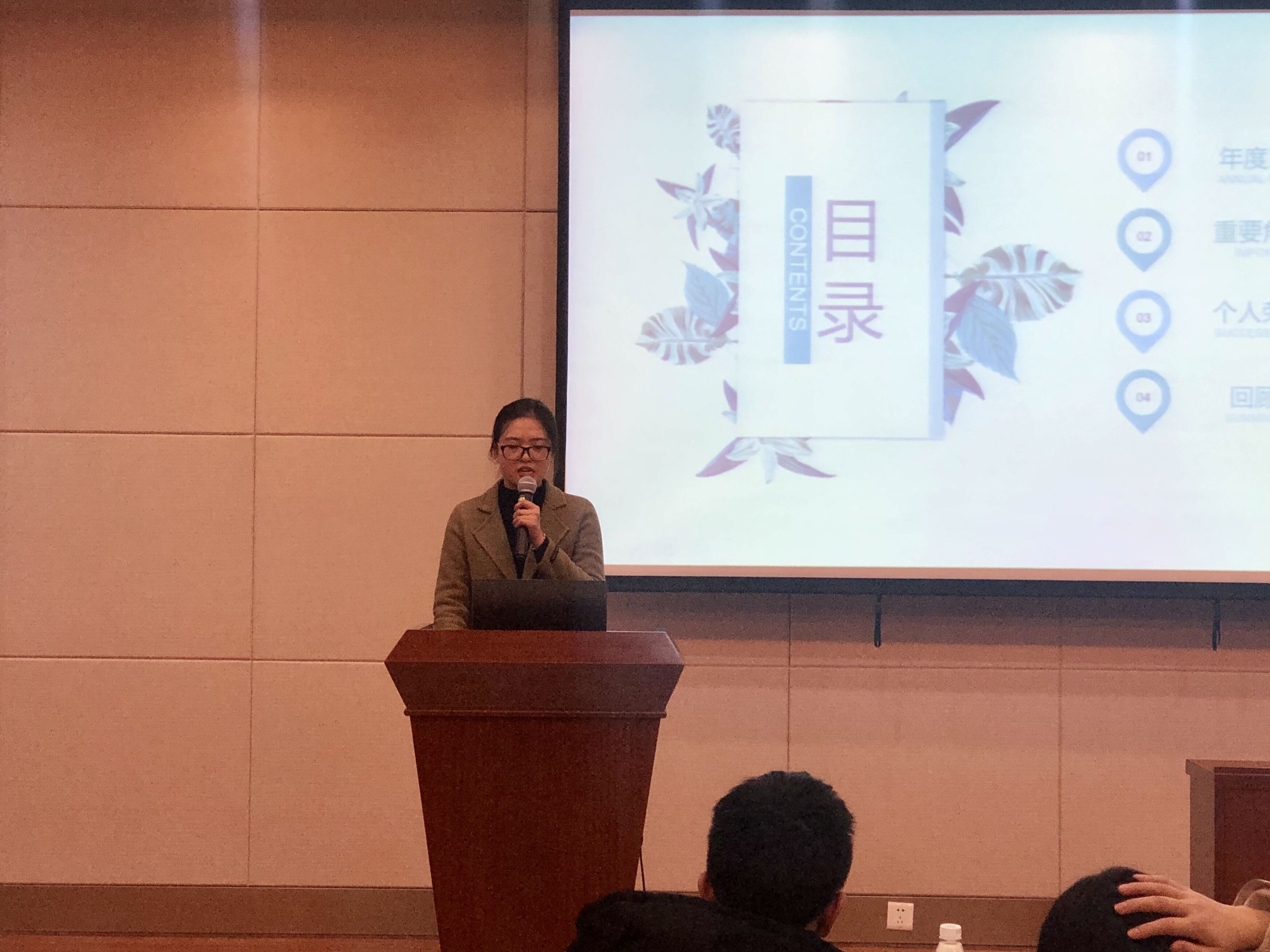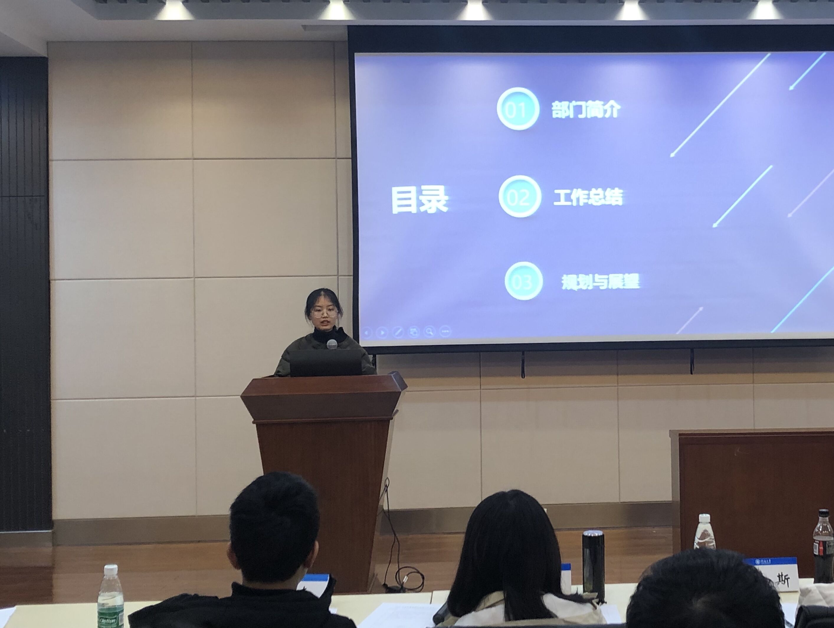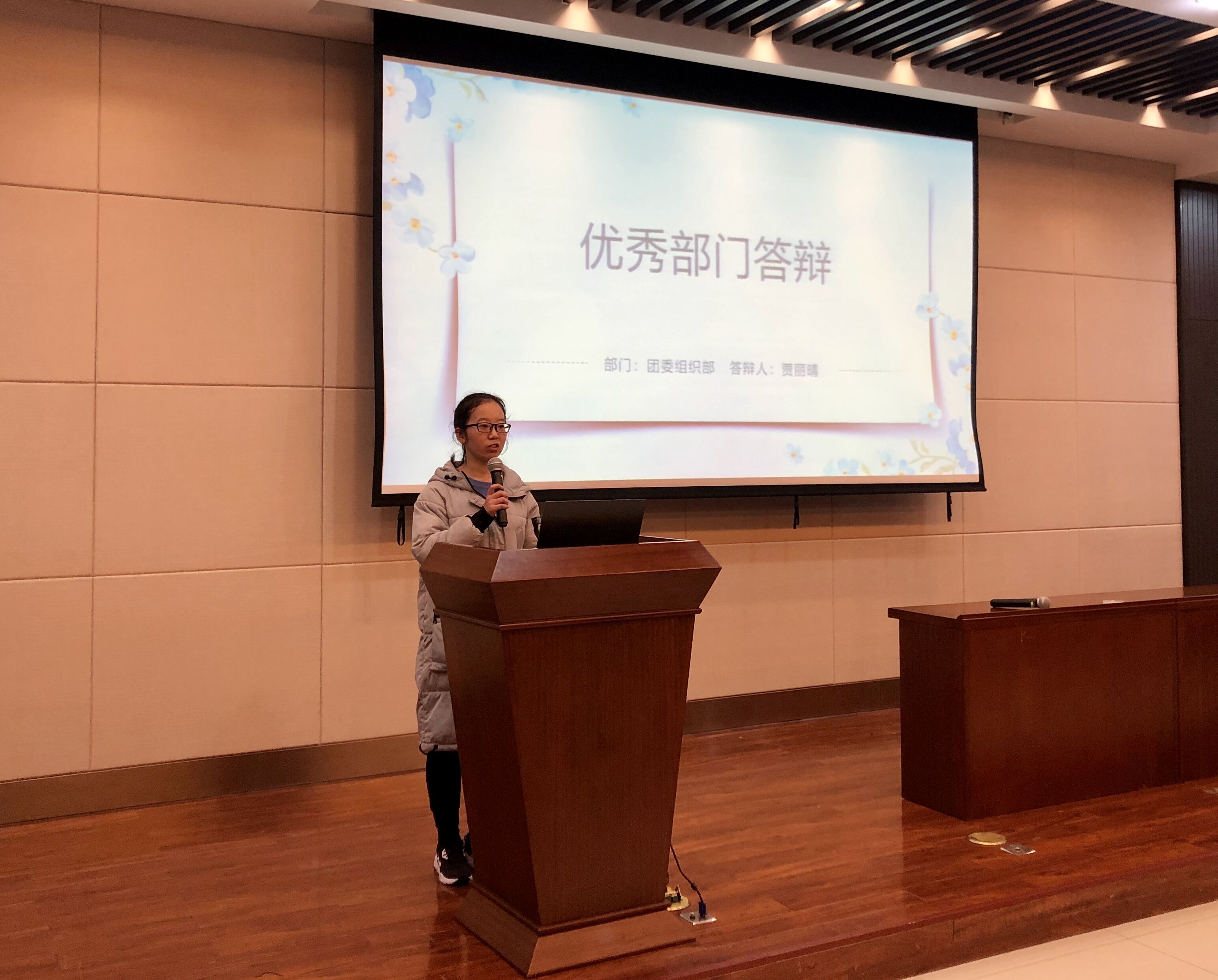 首先进行的是优秀部门的答辩环节,来自环境院学生会,团委,科协以及新媒体中心的各部门的部长轮流进行答辩。答辩过程中,各部门部长借助他们用心设计制作的PPT为评委和听众们带来了精彩的演讲。他们分别介绍了所属部门的性质与职责,简述了本学期部门所举办的活动并分享了丰厚的部门成果。从活动策划到团结建设,每个部门的辛勤劳动成果都得到了展示,部门的工作热情和凝聚力在答辩内容中也得到了体现。
