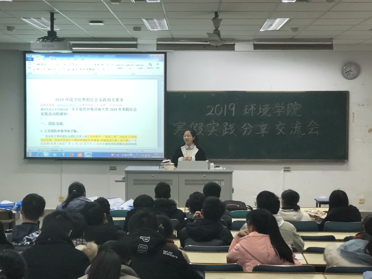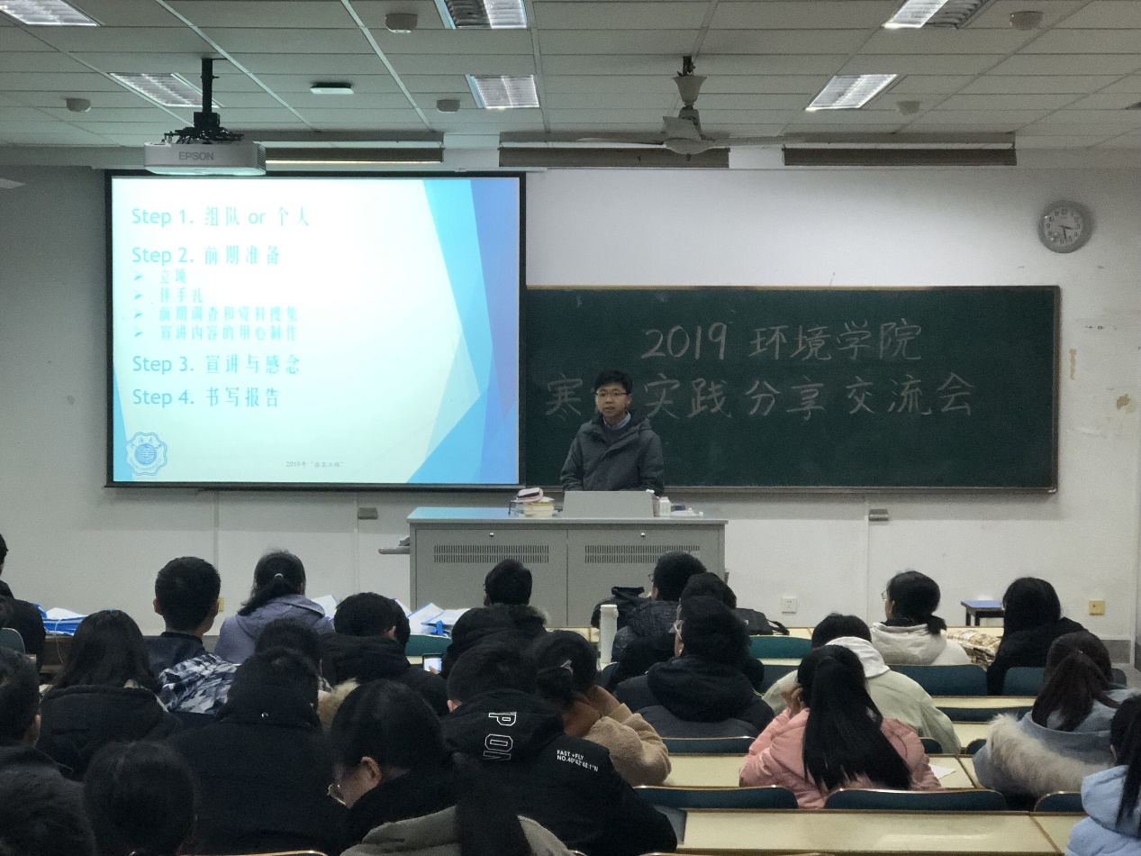 王少伟和汪涵同学则是参与了在环境院立项的团队实践。他们首先介绍了如何在回母校宣讲前做好前期准备,以应对学弟学妹和家长们的各种问题。然后他们为我们分享了物资准备经验,例如除学校提供的资料外还可以自己制作海报、书签和明信片等小礼物。此外,他们还分享了去年答辩时的PPT,并展示了优秀的申请书和策划书,让18级同学了解了如何去评选优秀实践团队。