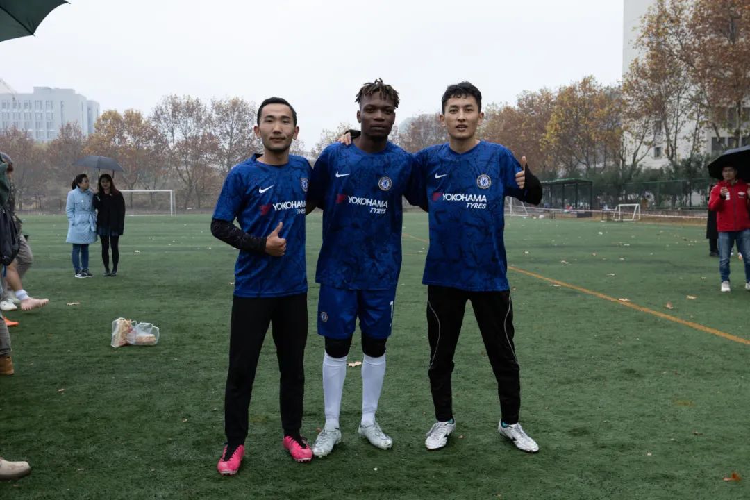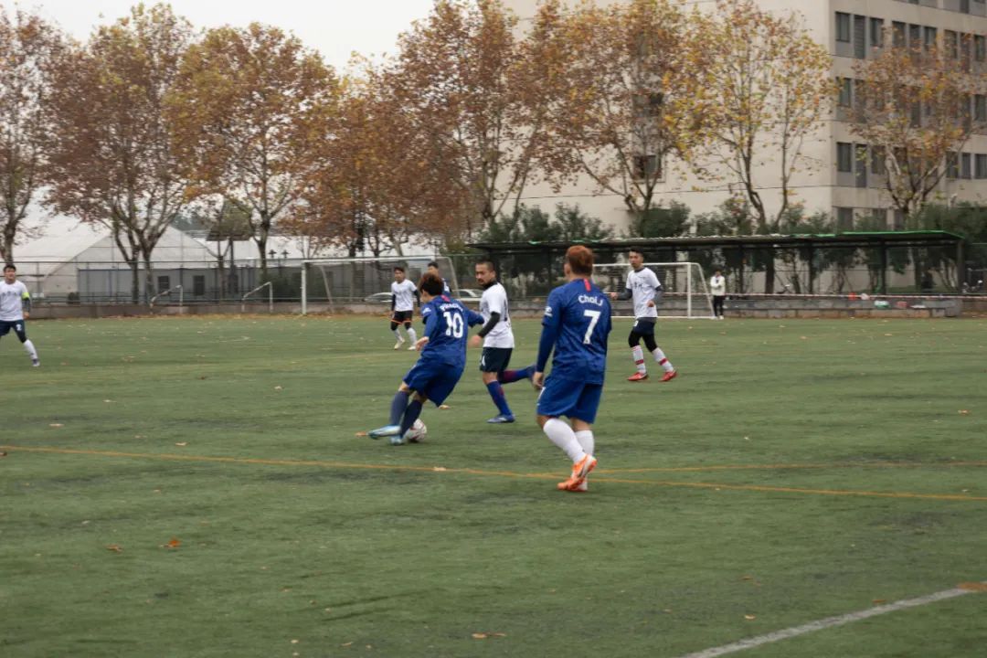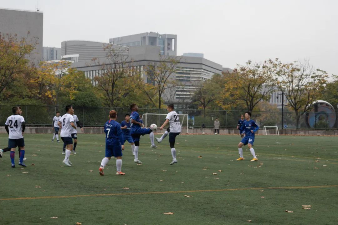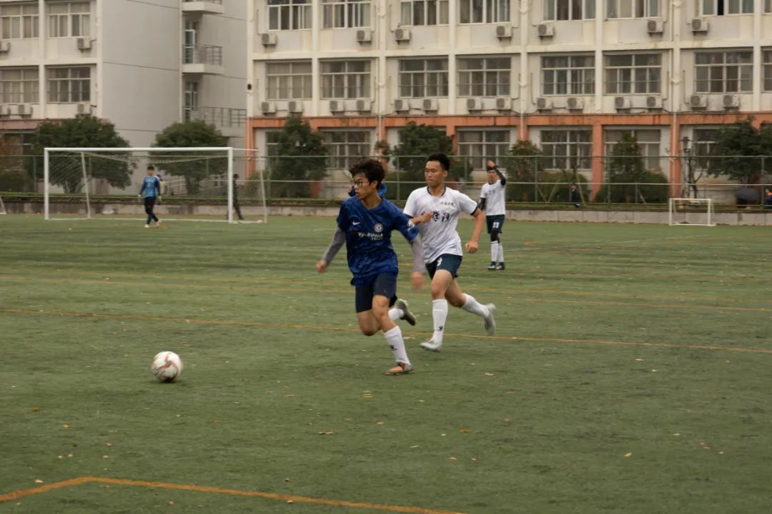 上半场比赛一开始,身着蓝色球衣的环境院球员们便与穿着白色球服的地学院的球员们展开了拉锯战。控球、传球、过人、防守、射门、扑救,球员们在绿荫场上奋力地奔跑,彰显着青春的风采。最终,在裁判的又一声哨响后,上半场比赛结束,球员们进入休息阶段。