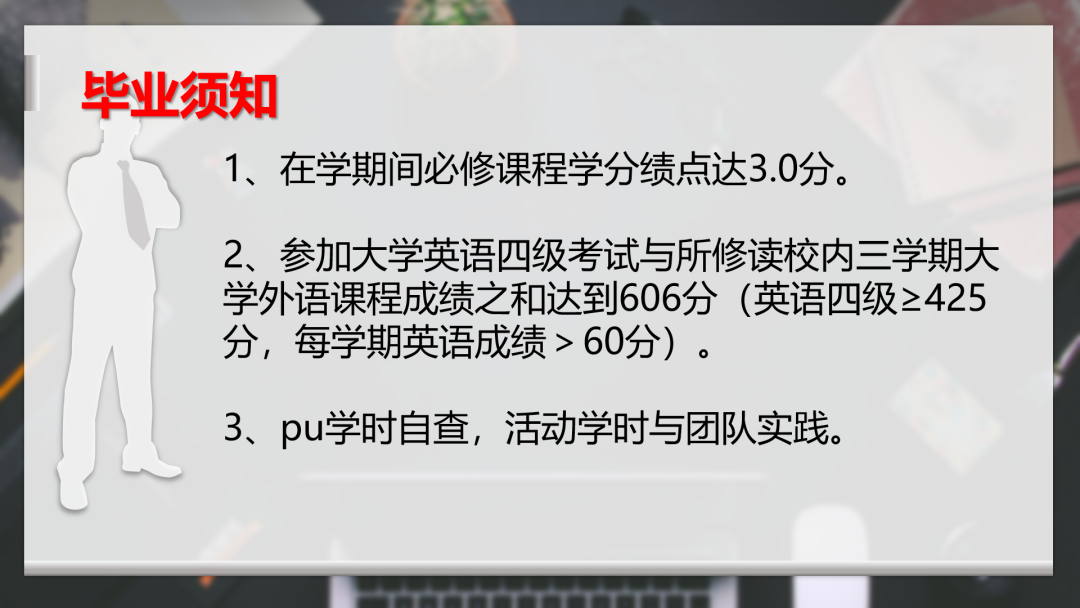 毕业季将要到来,2017级的同学们在校时间还有短短几个月。陈诗宇老师对毕业所需要的要求学分总分、英语水平、学时等问题做了说明,提醒同学们注重诚实守信,遵守考试纪律,切忌因为临近毕业而存在侥幸心理。并提醒暂且还未达到毕业要求的同学们,积极备考学习,抓住补考的机会,顺利毕业。