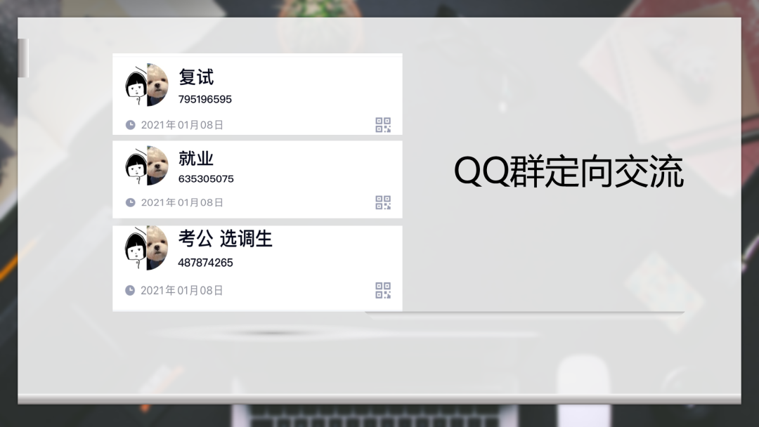 2020下半年受到疫情影响,秋季校园招聘无法顺利展开,故2021年春季校招成为同学们积极就业一大机会。陈老师结合近几年的数据,分析了2021届毕业生的就业情况。向即将毕业的2021届学子在就业问题、就业单位、就业城市等方面进行了介绍。并展示了韩漫 建立的考研复试、就业交流、公务员选调生交流群,为同学们提供了一个交流信息的平台。