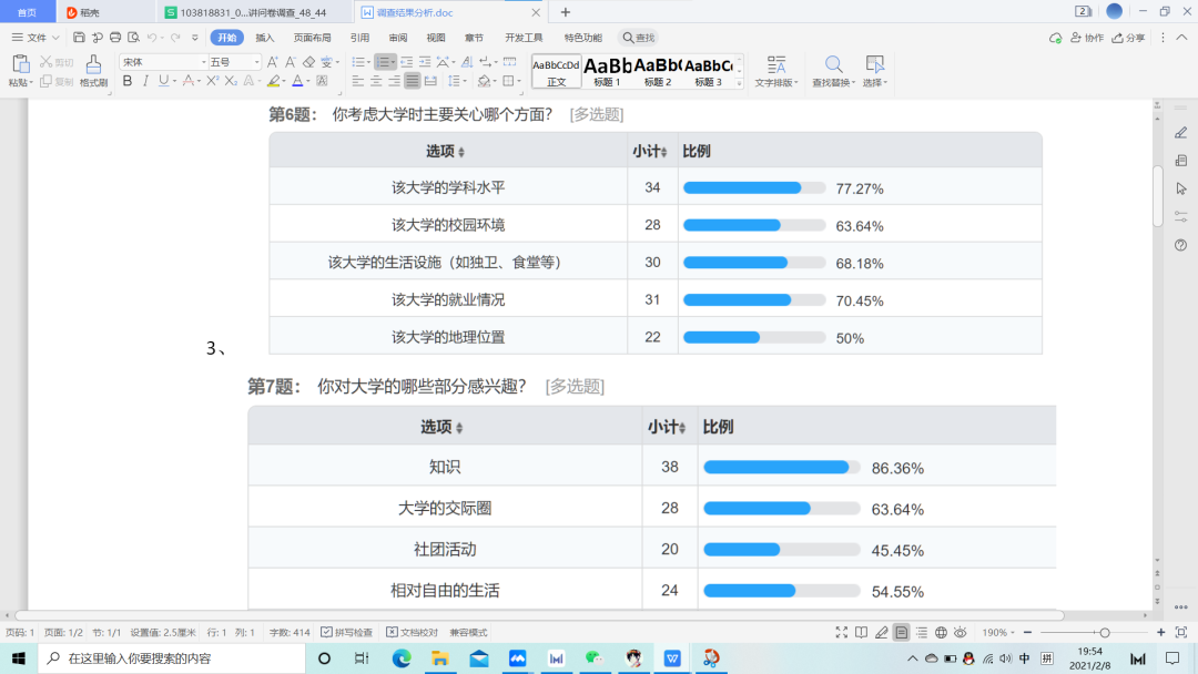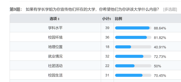 的学科水平和就业情况,同时相比于大学的社团活动和交际圈,同学们对大学知识更感兴趣。此次的问卷调查为之后的宣讲活动指明了方向,在后续的直播中团队成员依据调查结果着重宣讲韩漫