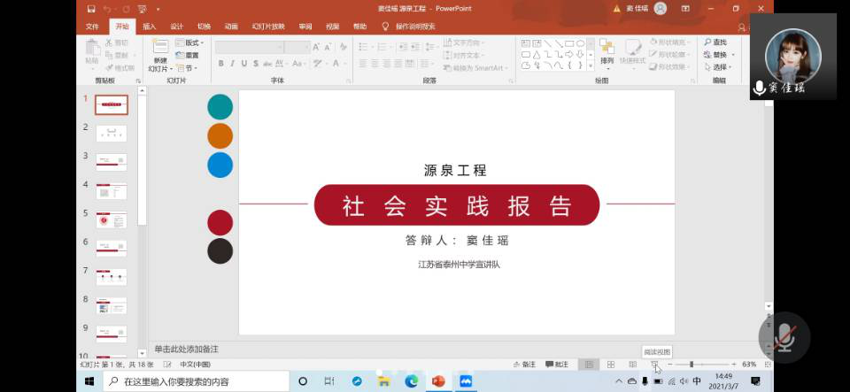 本次答辩一共有8支队伍参加。线上答辩由竞选队伍借助PPT形式阐述工作和评委提问两个环节组成。各位竞选队伍就活动目的、前期准备、宣讲过程以及活动影响等方面展开答辩,各自展示出自己团队在实践中的亮点。而后评委老师们根据答辩人介绍的实践过程和实践成果提出问题,如“通过什么渠道进行宣传并展开线上宣讲的”,“是否介绍过韩漫 ,是如何介绍环境类专业的”等问题,并提出改进意见,为答辩团队完善实践成果提供了方法论。