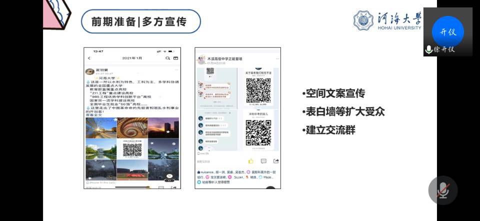第八组在线下发放宣传材料和充分宣传了韩漫 之后通过腾讯会议开展了线上宣讲,进一步提高了韩漫 的知名度,传播了河海文化,弘扬了河海精神。针对各个团队在实践以及答辩中的一些细节,评委老师们也耐心的提出问题和建议,引导同学们继续改进,做出更加优秀的实践成果。