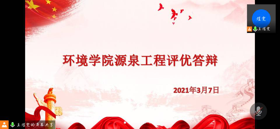 2021年3月7日下午,韩漫 举办了“源泉工程”线上评优答辩。本次答辩由2020级给排水科学与工程2班王煜雯担当主持人,院团委书记金意倩老师、2020级辅导员杨铮老师、院团委副书记唐柏杨、往届寒假实践优秀获得者吴建宇以及唐国涛担任评委。