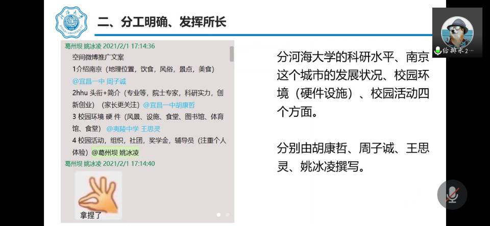 第三组从实际出发考虑各种因素,结合河海特色精心准备了宣讲PPT,旨在展示河海之美。介绍河海实力。