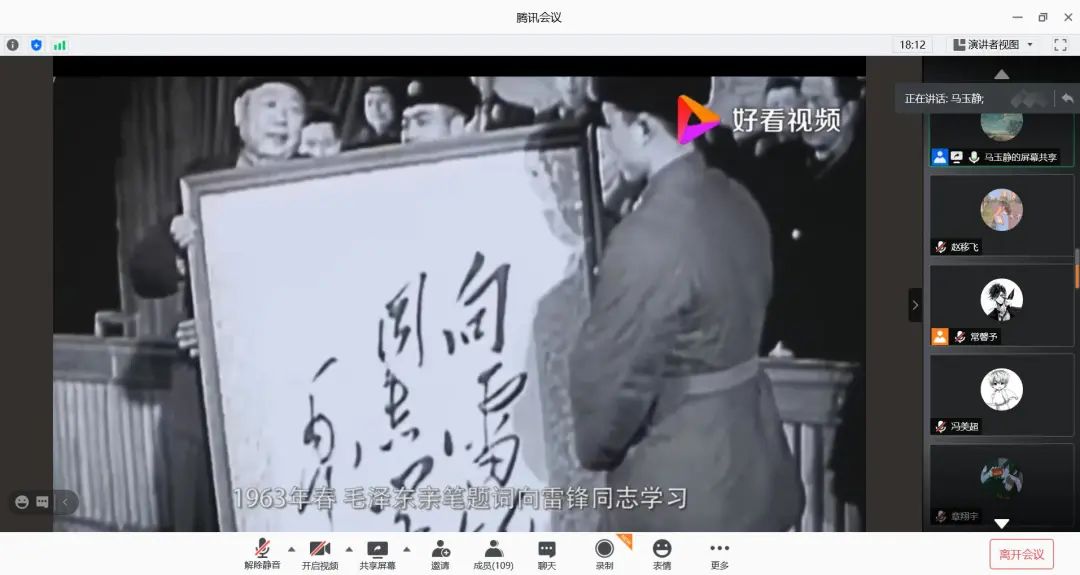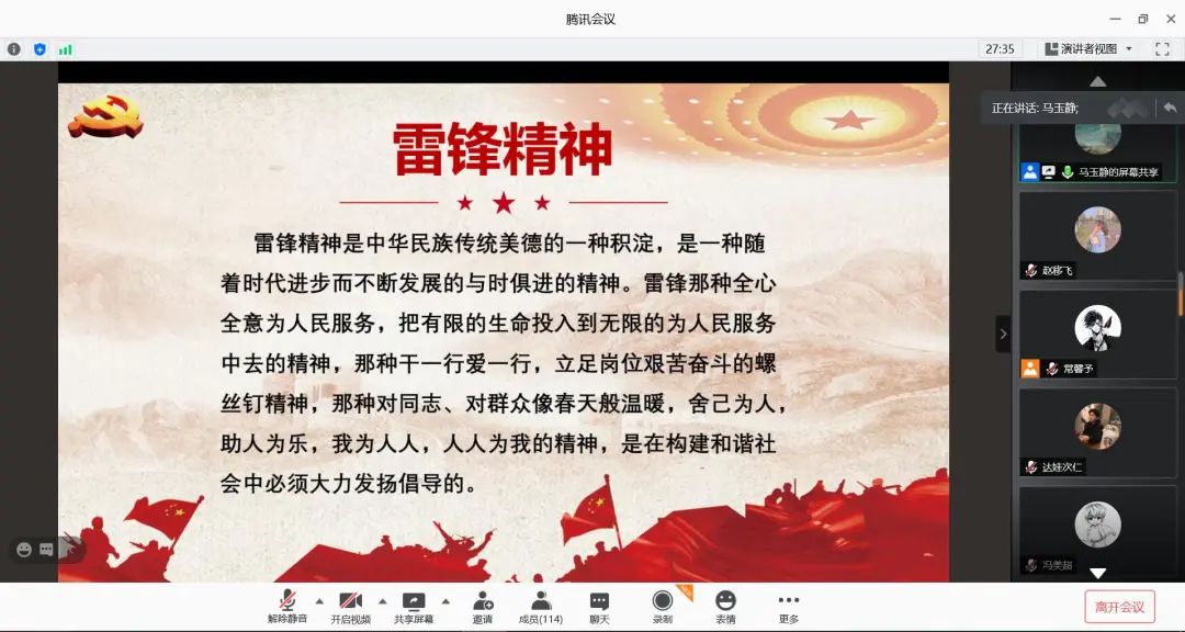 3月5日是第58个“学雷锋纪念日”,为响应国家学雷锋的号召,韩漫 团委青协于晚七点在腾讯会议上面向参加管培的同学们举办了雷锋精神线上宣讲会,弘扬雷锋精神,践行初心使命。