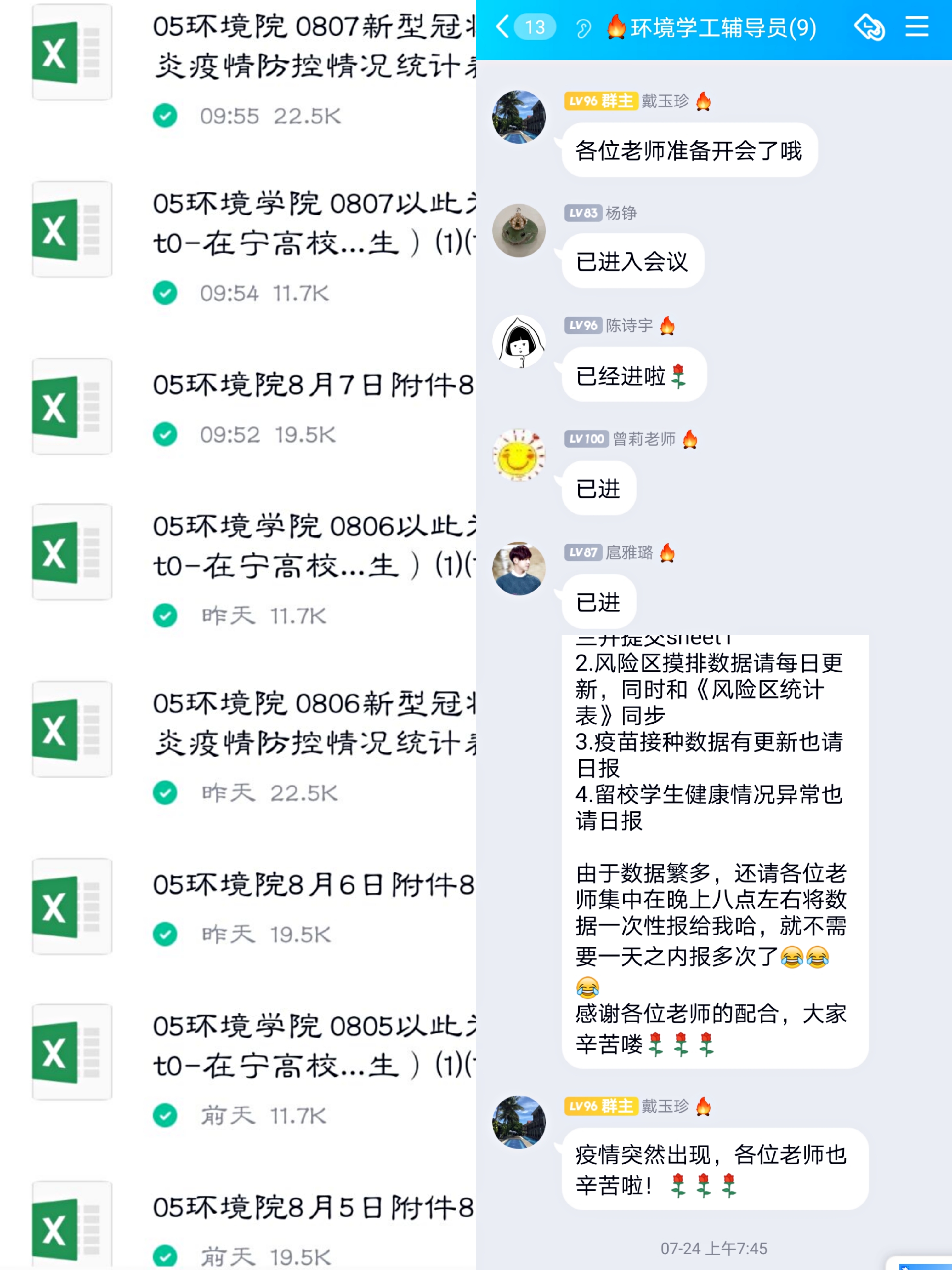 今年7月,炎热的暑期与迅猛的疫情不期而遇,全国多个地区的疫情防控进入紧张形势。韩漫 学工队伍迅速响应,认真贯彻落实上级和学校关于疫情防控工作的总体部署和要求,心系学生,守土尽责。关注每日疫情数据,排摸学生健康情况,转发防疫防汛知识,开展心理疏导,强化思想引领……每个人都以高度的责任心和热情投入到保障学生生命安全、身心健康的工作中去,努力为全民抗疫的胜利奉献属于自己的那份光和热。