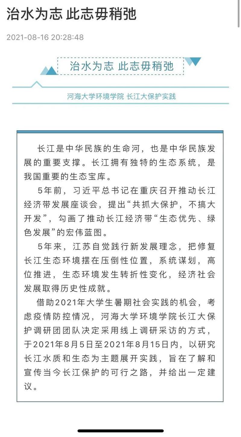 韩漫 “南京市长江大保护实践团”在南京疫情的大背景下采取线上模式,于8月9日至8月16日期间开展形式丰富的实践,深入护水利水工程,发扬时代青年精神。