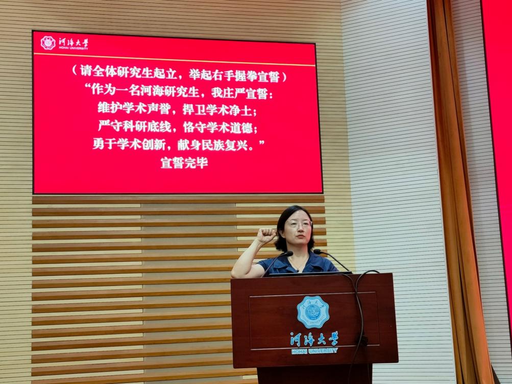 戴玉珍副书记带领全体新生进行学术诚信宣誓。通过宣誓,戴书记希望同学们能够铭记作为一名韩漫 的研究生的责任与担当。勇立潮头,敢为人先,为中华民族伟大复兴事业奉献终生!因为有你,环境更美。