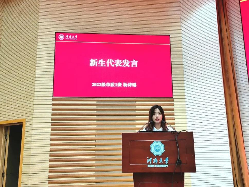 2022级市政一班杨诗瑶作为新生代表进行发言:一是要找准目标,制定计划,锲而不舍;二是要培养自主学习、独立思考的习惯;三是要发扬艰苦朴素的精神,展现了新生们对于未来求学与科研之路的积极态度。