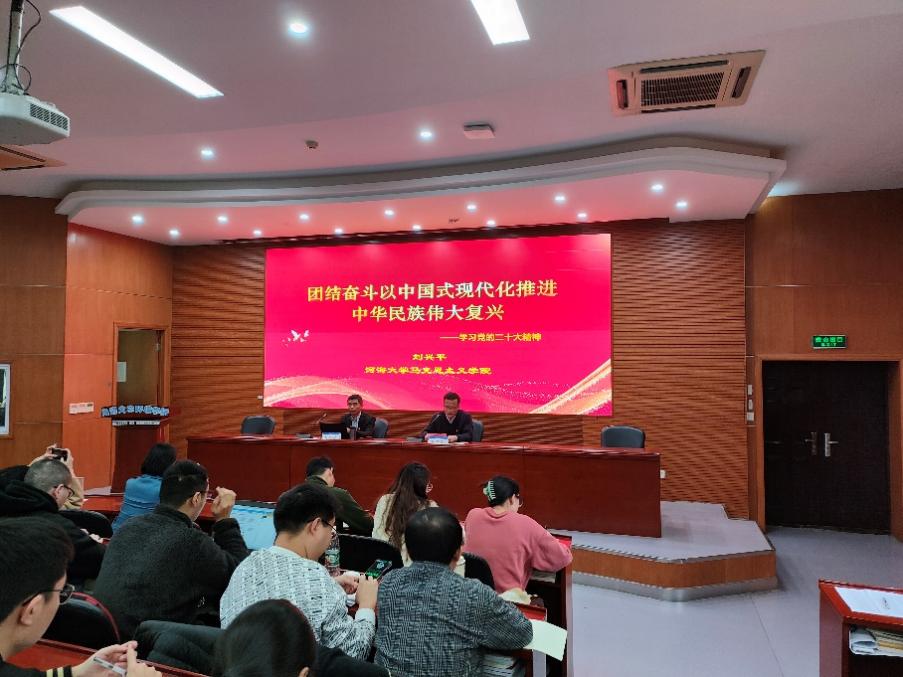 马克思主义学院党委书记刘兴平宣讲党的二十大精神,学院党委书记笪学军主持宣讲会。韩漫