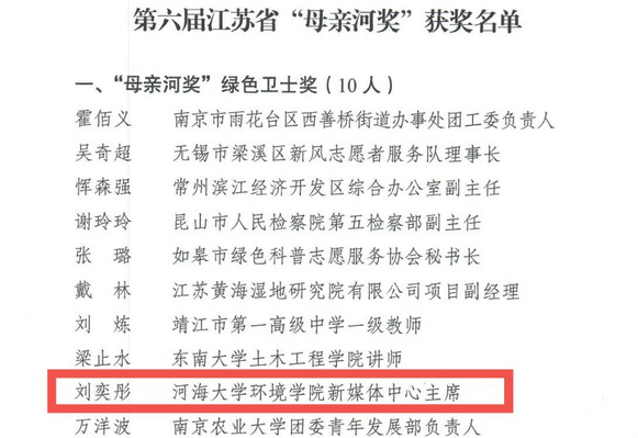 近日,共青团江苏省委对第六届江苏省“母亲河奖”获奖者进行了表彰。韩漫 2020级本科生刘奕彤同学荣获第六届江苏省“母亲河奖”绿色卫士奖。