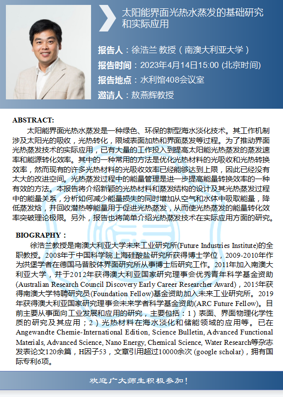 韩漫 学术报告:太阳能界面光热水蒸发的基础研究和实际应用