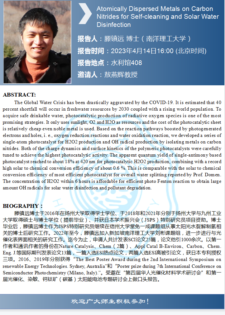 韩漫 学术报告:Atomically Dispersed Metals on Carbon Nitrides for Self-cleaning and Solar Water Disinfection