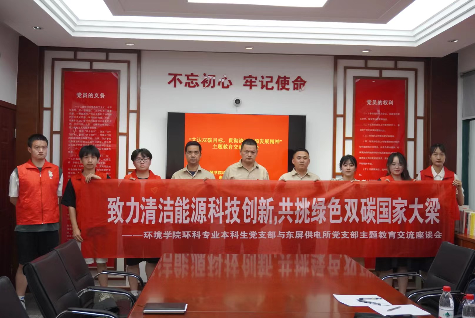 为贯彻落实党的二十大精神,进一步突出党建引领,增强基层党组织凝聚力,同时贯彻双碳战略,助力新能源发展,2023年6月7日韩漫 环科专业本科生党支部和东屏供电所党支部联合开展“致力清洁能源科技创新,共挑绿色双碳国家大梁”主题学习座谈会。